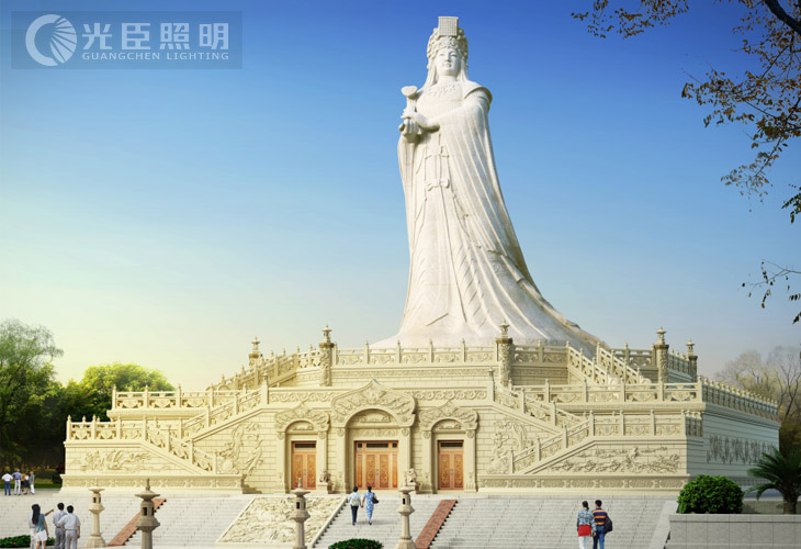 結合參照物體的亮化背景,媽祖像高度約30米左右,實現媽祖石像整體打亮,光臣照明為此定制一款大功率400W投光燈,DMX512金黃外控洗墻燈及LED藍光小射燈作為本次媽祖亮化燈具,在白總與光臣照明的同共努力下,效果呈現與設計方案效果還原度高達99%。