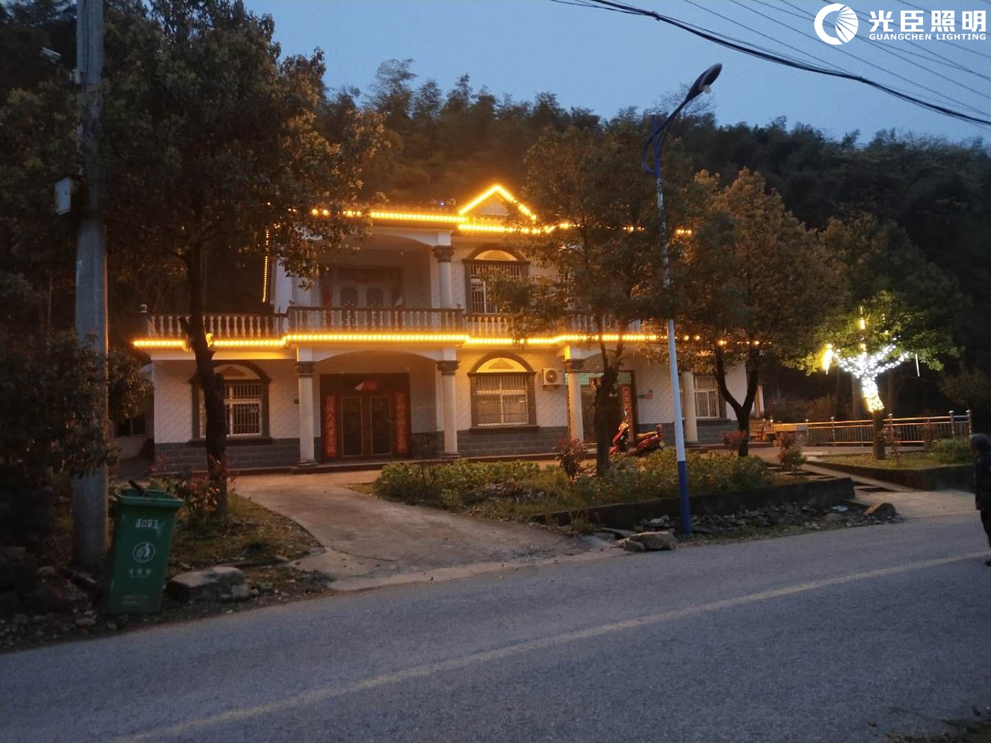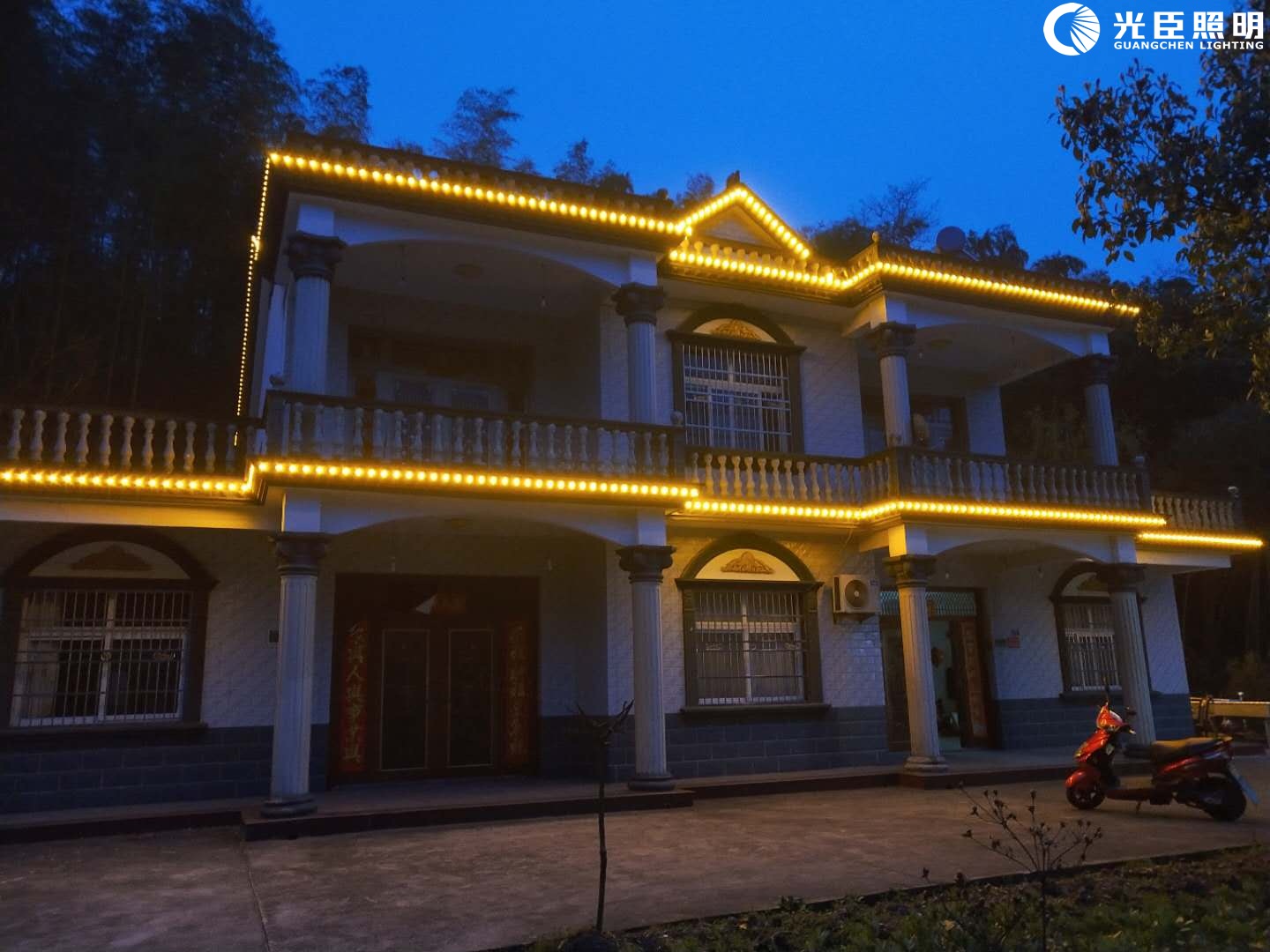 此次的項目是去年合作過一個地產樓盤蔡總自家房子亮化。通過上個項目,蔡總對我們產品質量和服務都是豎拇指的。因為這次是鄉村的房子,蔡總那邊表示不要過于花哨,想要那種星星點點的感覺。有了上個項目的磨合溝通,業務員和蔡總這邊很默契,很快制定了方案,選定光臣直徑3公分點光源圍著樓體走一圈。燈光的色溫和布點位置與建筑形體、色彩和景觀空間完美結合,形成了極強的高端感受和靜謐氛圍。