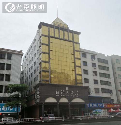 本次酒店外墻亮化選用了LED線條燈做為簡單的輪廓勾勒、LED星光燈及點光源作為墻面點綴燈具,一閃一閃的效果相當耀眼,由于墻角安裝燈具的面積有限,光臣照明特意定制一批與墻面安裝尺寸相符的LED墻角燈,發光效果十分好看。為了讓酒店塔頂顯得更加奪目,添加了金燦燦的36W金黃光洗墻燈突顯它的造型感。