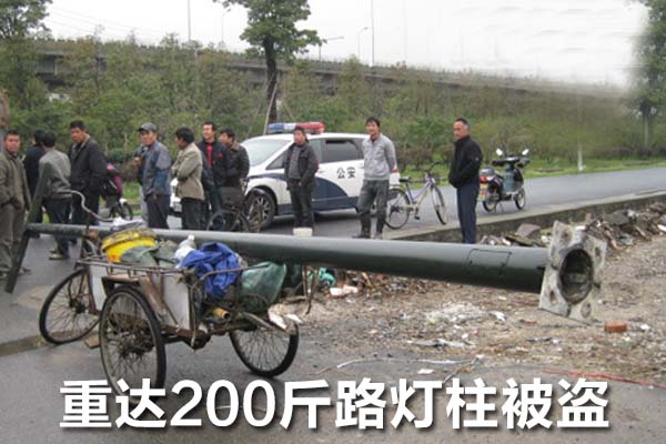 次年2010年3月,杭州濱江路上一男子用自己腳踏三輪車承載著正準備安裝的6米路燈燈柱,該燈柱重達200斤。幸好被周邊民眾圍堵后攔下來,隨后民警趕到現場。