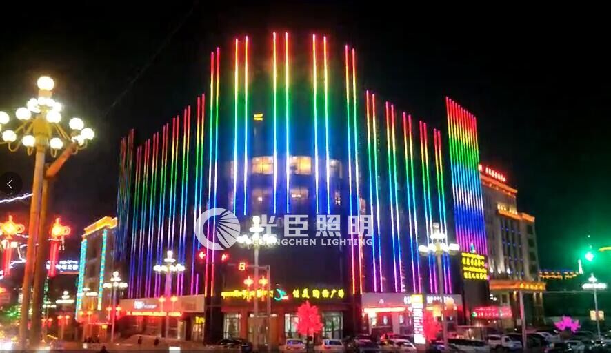 本次亮化同樣采用的是LED全彩八段外控LED線條燈,商場外立面的縱向突出位置都安裝,整體出全彩屏效果。LED線條燈外殼顏色是深咖啡色,與外墻顏色一致,在白天能更好地隱藏起來。