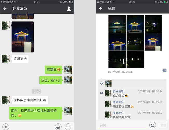 上周六晚上,客戶到現場觀看涼亭亮化效果,被現場美麗的景象給迷住了,忍不住發了個朋友圈讓大家也一同欣賞,另外他還特意給我們的業務經理發了現場圖片,感謝他的認可與支持,也歡迎大家來電咨詢:18826034118