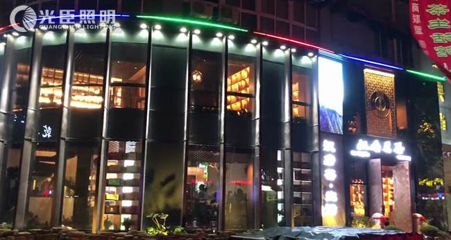 客戶希望做成全彩的效果,因此這里用到的是LED全彩八段線條燈做頂部輪廓,搭配窄光束投射燈對立柱打光,增強立體感,完成了本次亮化。