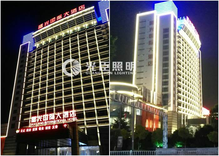 該酒店原本是已經有做LED夜景亮化的,但是由于原來的亮化過于簡單,燈光效果暗,所以為了讓酒店成為當地夜景的一大亮點,提升酒店整體形象,近期對它進行亮化燈光的提亮工作。光臣照明有幸為這次項目提供了亮化燈具。