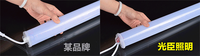 1、PC外殼:光臣照明選用的PC外殼是重量達到180g~200g的PC管(常規(guī)以180g為主,可定制200g以上重量),產品厚度均勻透光性及抗壓能力好。和市面上的80~90g標價8元/米的LED數(shù)碼管質量相比,沒有可比性。