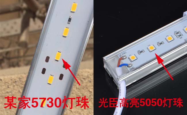 (1)光源的選用:多次與追求利潤更大化的朋友,請不要忽略品質!出問題的時候得不償失!從圖片上看這根線條燈是用5730燈珠作為燈具光源,我們不是說5730燈珠不好,用在室內燈具生產上它也是個好光源。光臣照明所生產的LED線條燈一律不采購5730燈珠作為光源,主要以5050晶元、三安、3030歐司朗、3535外露燈珠、科銳、普瑞等等戶外燈具專用光源。