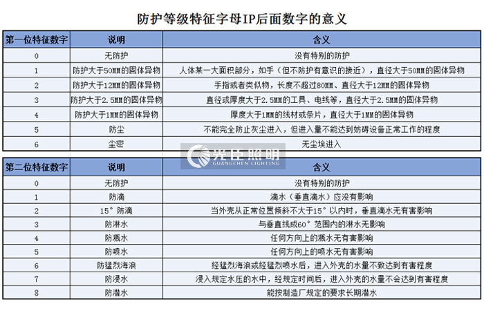 光臣智科同樣沿用國際上采用的字母“IP”(International protection)后面跟兩個數字來表示燈具的防塵、防水等級。前一位數字表示對人、固體異物或塵埃的防護能力,后一位數字表示對水的防護能力,見下圖: