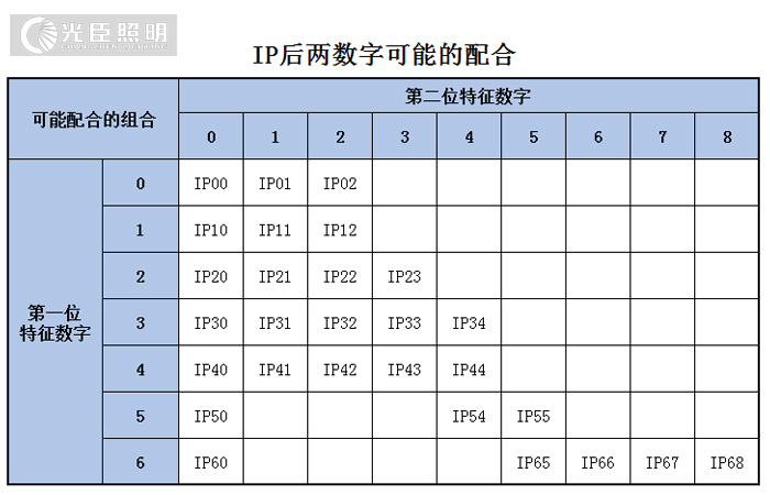 顯然,LED亮化燈具在防塵能力和防水能力之間存在一定的依賴關系,也就是說前一位數字和后一位數字之間有一定的依存關系,大家看小編為大家整理的下面這張結合配圖: