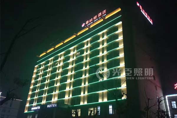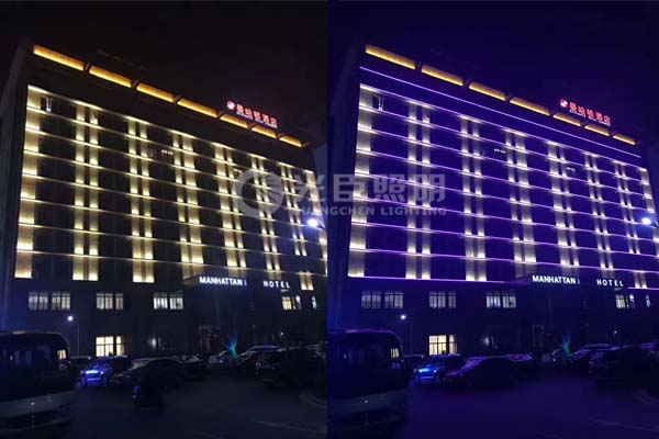 MANHATTAN酒店管理集團旗下的曼哈頓酒店是四星級標準的商務酒店,上海王小姐憑借她們公司實力及酒店亮化經驗,在多個招投標項目中使用光臣照明的燈具贏得了好幾個四星級連鎖酒店的亮化施工權,本次曼哈頓酒店亮化選用了光臣照明新推出的兩款LED洗墻燈以及排水結構的LED線條燈作為酒店亮化的主要燈具。