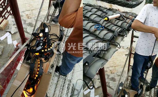 大部份瓦楞燈的安裝都選擇第二種安裝方法。以上是我們貴州的一個旅游景區在安裝LED瓦楞燈的圖片。工作們把瓦楞燈先串接好后再把鋁片調整好角度進行粘合。