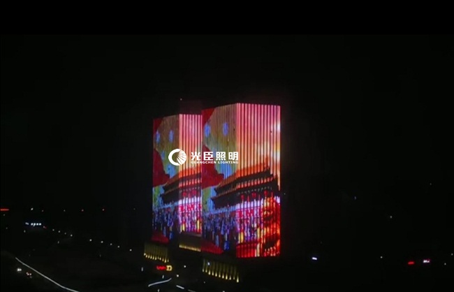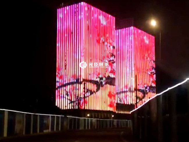 A、B雙子大樓夜景亮化主要以全彩線條燈做屏的形式,采用DMX512八段RGBW線條燈,合計一萬多米,縱向安裝。