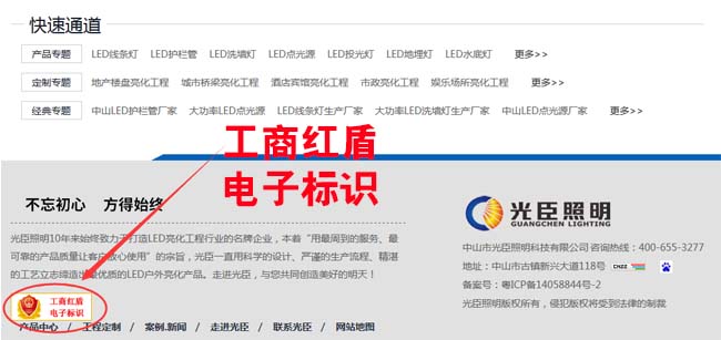 大看可以通過這個標識去了解該公司的資質,紅盾電子標識一般會安裝在網站的底部位置,這也是您找線條燈廠家的一種標準之一哦,光臣照明從網站建站開始已取得紅盾電子標識,您可以通過官方網站首頁底部查看。