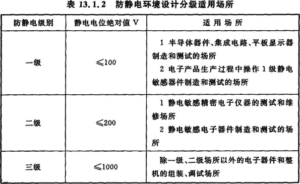 13.1.2 防靜電環(huán)境設(shè)計(jì)應(yīng)按電子產(chǎn)品或生產(chǎn)工序(設(shè)備)進(jìn)行分級。防靜電環(huán)境內(nèi)靜電電位絕對值應(yīng)小于電子產(chǎn)品的靜電電位安全值。防靜電環(huán)境設(shè)計(jì)應(yīng)分為三級,防靜電環(huán)境設(shè)計(jì)分級適用場所應(yīng)符合表13.1.2的要求。