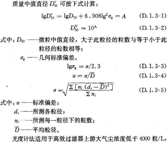 D.1.3 光度計法可用于最大穿透率大于等于0.001%的過濾器檢漏,應采用多分散的檢漏氣溶膠,其質量中值直徑為0.5μm~0.7μm,幾何標準偏差約為1.7。