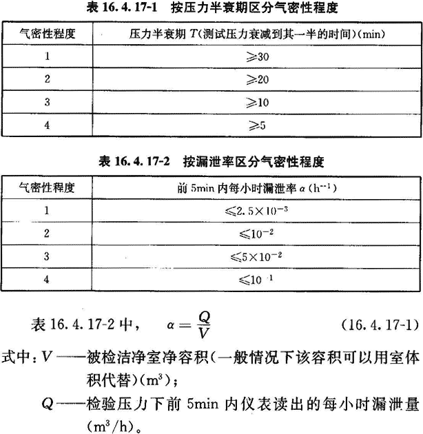 16.4.17 當對潔凈室的嚴密性有特殊要求時,可測其圍護結構嚴密性。圍護結構嚴密性按附錄G檢驗。檢驗結果應符合設計要求。當設計無明確要求時,可在以下兩表的任何一種評定方法中任選一種方法,兩表中最大測試壓力設定為500Pa。