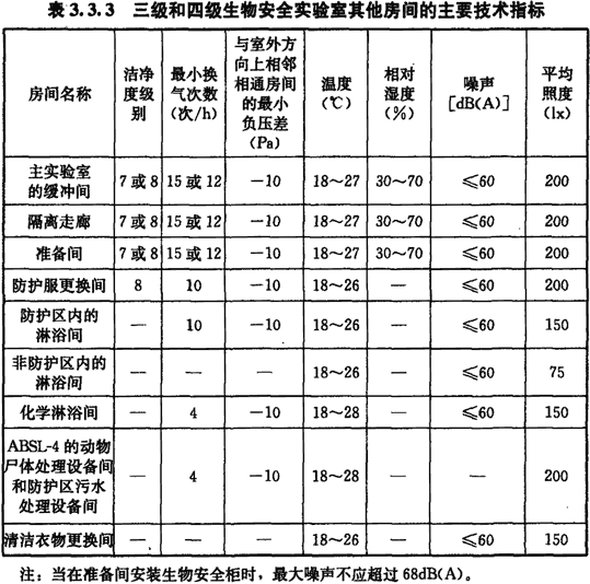 3.3.3 三級和四級生物安全實驗室其他房間的主要技術指標應符合表3.3.3的規定。